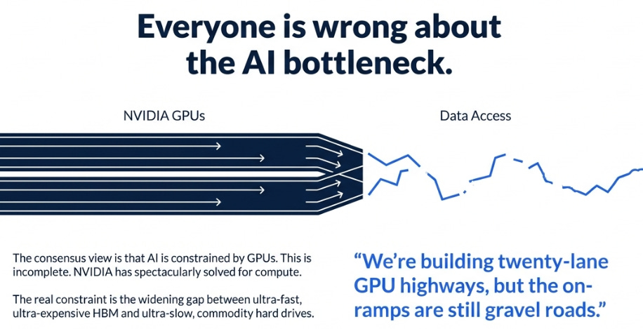 The bottleneck isn’t the GPUs. NVIDIA solved that spectacularly. The bottleneck is memory—specifically, the gap between where AI models need data to be and where that data can economically exist.