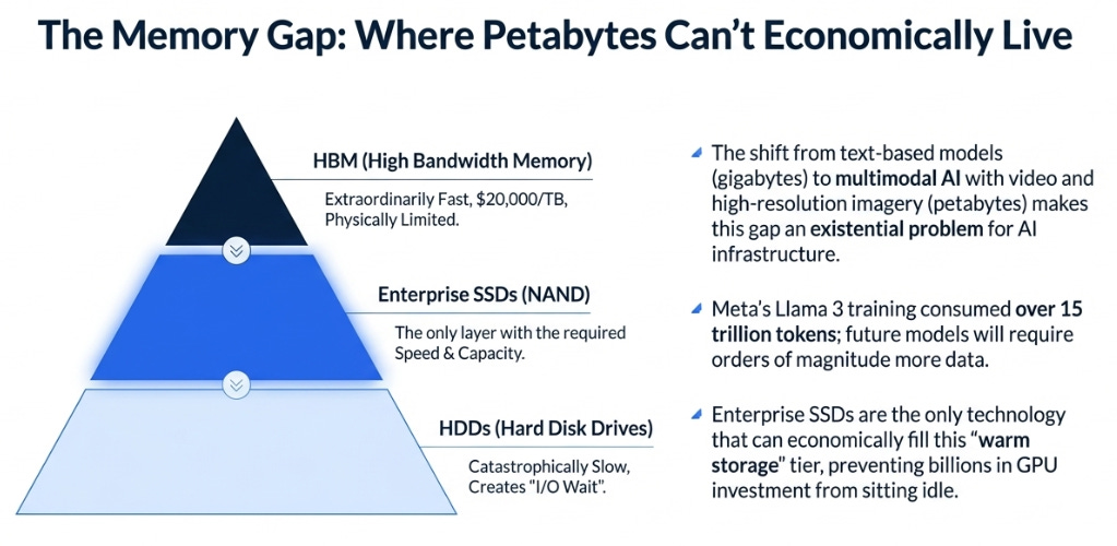 HBM is too expensive and limited; HDDs are too slow—only high-capacity enterprise SSDs economically fill the gap.