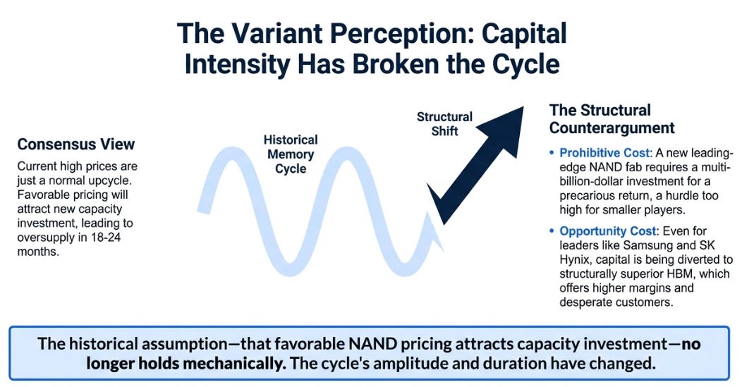 NAND’s moment arrives if the cost of adding supply has finally exceeded the reward for share gains. This represents a real structural shift supported by observable changes in capital requirements and competitive dynamics. But structural shifts in demand don’t eliminate cyclicality if supply can respond. The challenge is recognizing the window is time-bound.
