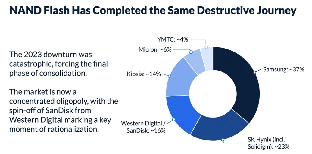 NAND flash just completed this journey. The 2023 downturn was catastrophic; pricing fell sharply, manufacturers reported billions in losses. A concentrated set of major suppliers emerged: Samsung controls approximately 37% of NAND revenue share, with SK Hynix (including Solidigm), Micron, Kioxia, Western Digital, and YMTC accounting for the remainder. When Western Digital split into two public companies in February 2025—WD retaining the HDD business while spinning off Flash under the SanDisk brand—it was joining an oligopoly that might finally choose discipline over destruction.