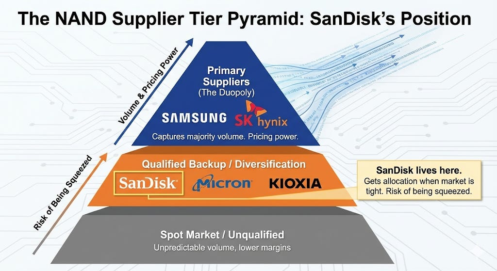 Here’s what the procurement dynamics likely look like—and it’s important to note this is analytical inference rather than disclosed fact: SanDisk probably qualifies as approved vendor at multiple hyperscalers but occupies backup tier for most. In typical enterprise procurement patterns, customers maintain two primary suppliers capturing the majority of volume, with additional qualified backups splitting the residual. If this pattern holds for NAND, SanDisk gets backup allocation—valuable during tight markets, but temporary. When supply loosens, volume shifts back to Samsung and SK Hynix.