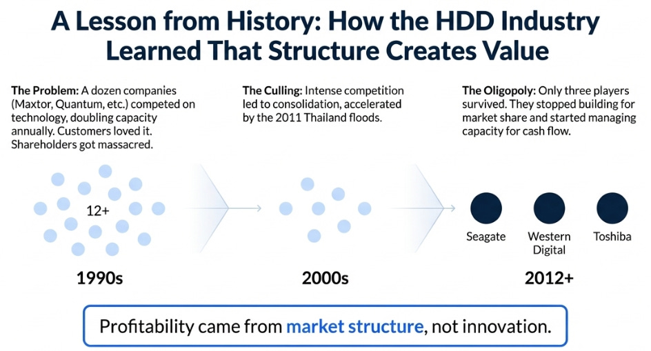 Yet capital-intensive oligopolies have long histories of discipline breaking precisely when it’s most valuable. HDDs reconsolidated to effectively two primary players by 2012, yet even that duopoly hasn’t generated spectacular returns. DRAM experienced similar consolidation but still suffers brutal cycles. Structure improvement is necessary but insufficient—it creates potential for sustained profitability without guaranteeing it.