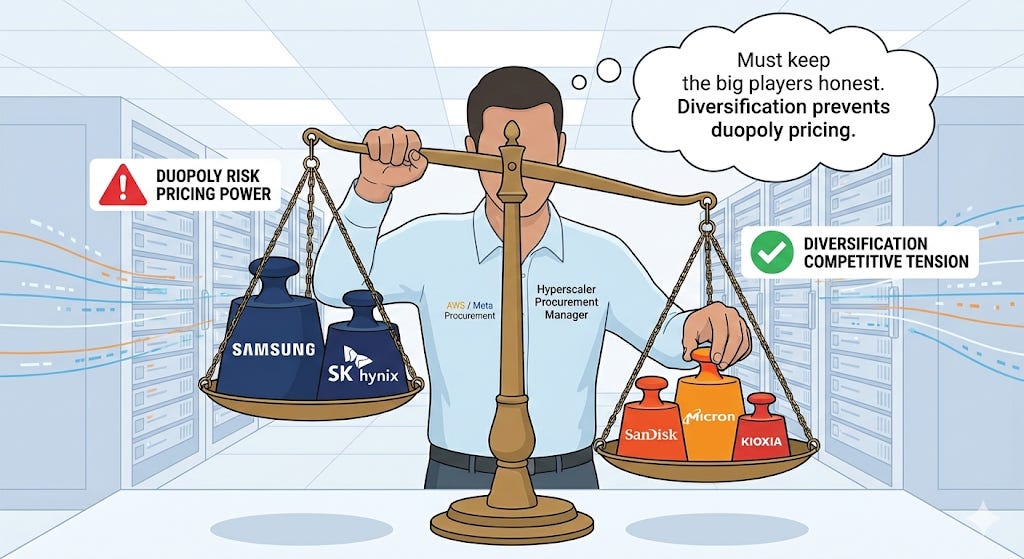 This is where SanDisk becomes strategically valuable—and here we’re moving from observed facts to strategic hypothesis: hyperscalers likely can’t let SanDisk fail without ceding pricing power to Samsung and SK Hynix. This doesn’t mean SanDisk can price arbitrarily—it means SanDisk gets qualified, receives allocation during tight markets, and potentially captures premiums for being the diversification option.