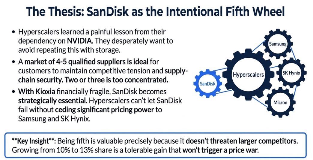 The counterintuitive part is this: being fifth is valuable precisely because it doesn’t threaten larger competitors. If SanDisk tried capturing 15% share, it would trigger defensive responses—Samsung would deploy capital to protect position, potentially flooding the market. But growing from 10-11% to 13% represents marginal gains larger players can tolerate.