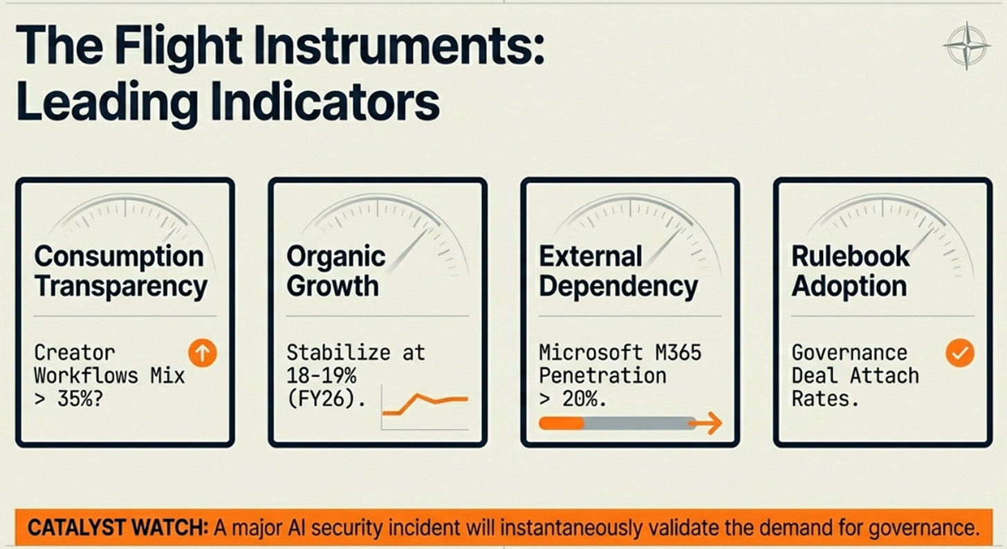 Requires: Microsoft Agent 365 at 30%+ penetration by FY27. Creator Workflows >40% of net new ACV. Margins stabilize then expand. Ideally, major security incident validates governance demand.