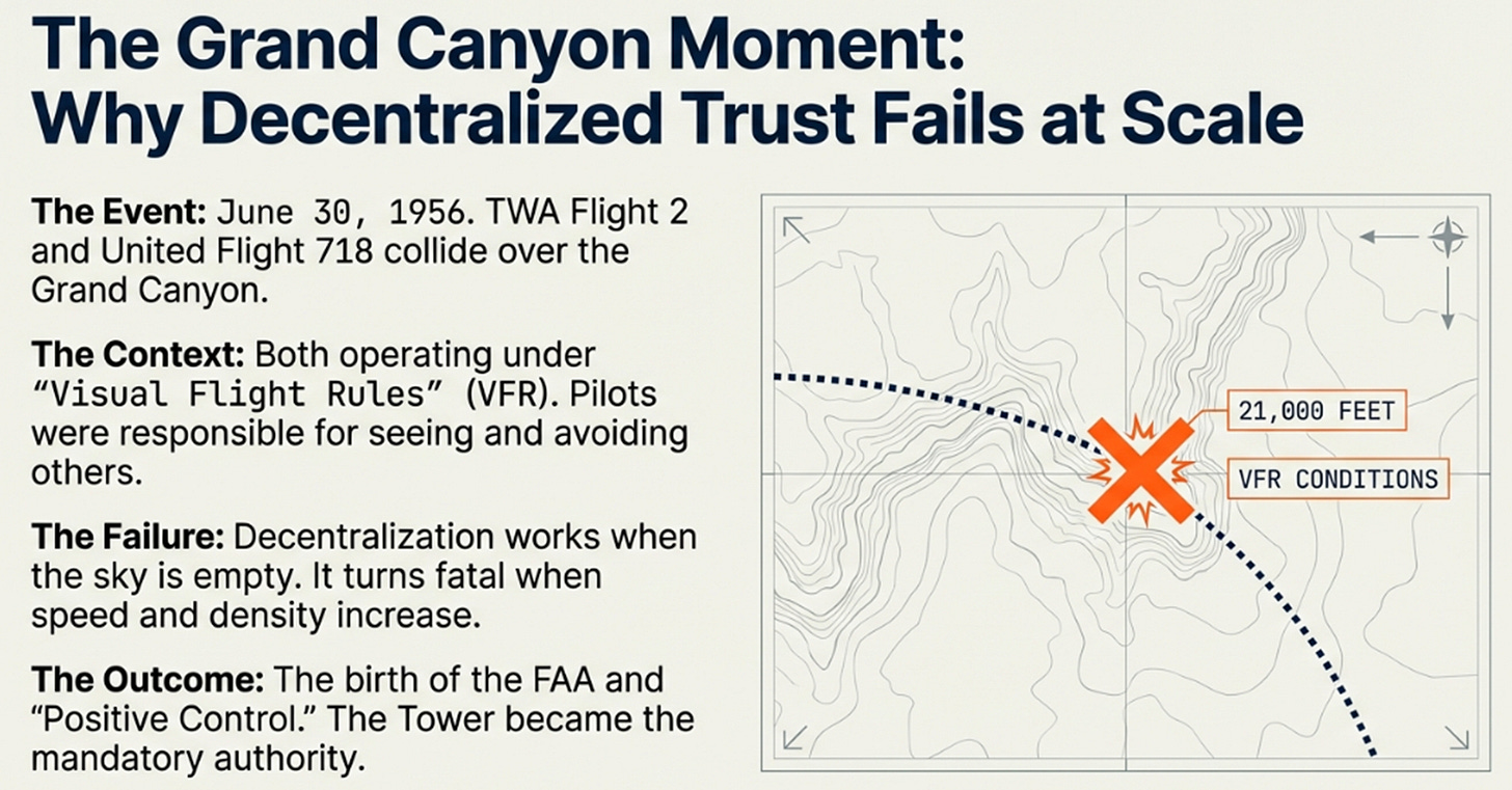 On June 30, 1956, two aircraft collided over the Grand Canyon. TWA Flight 2 and United Airlines Flight 718 met at 21,000 feet. All 128 people aboard died. The two planes had been operating under Visual Flight Rules, pilots responsible for seeing and avoiding other aircraft. It was decentralized, high-trust, and worked perfectly when the sky was empty and planes were slow.