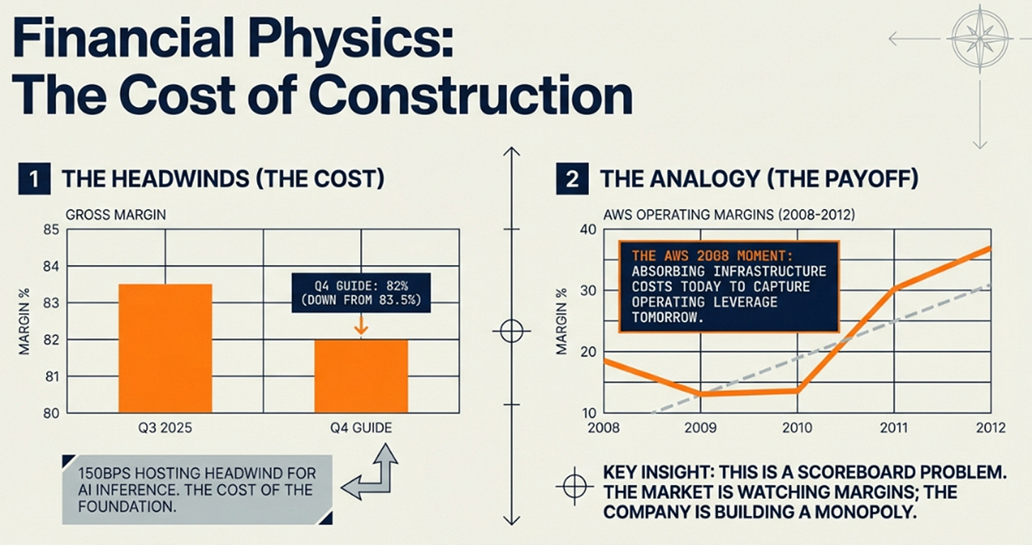 The 82% margin guidance represents building costs. AI inference expenses are real; ServiceNow is absorbing them to land customers, betting on future operating leverage. This mirrors AWS 2008-2010: compress margins during land-and-expand, capture leverage as usage compounds.
