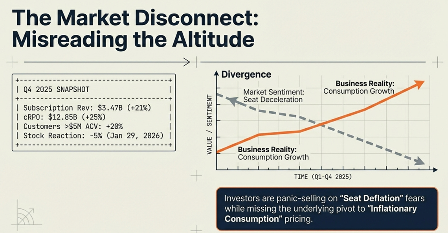 The market focused on deceleration, organic growth toward high-teens at $13B scale. But the business model is pivoting underneath. Seat-based pricing is deflationary when agents replace humans clicking interfaces. Consumption-based pricing is inflationary when agent activity increases work routing complexity.