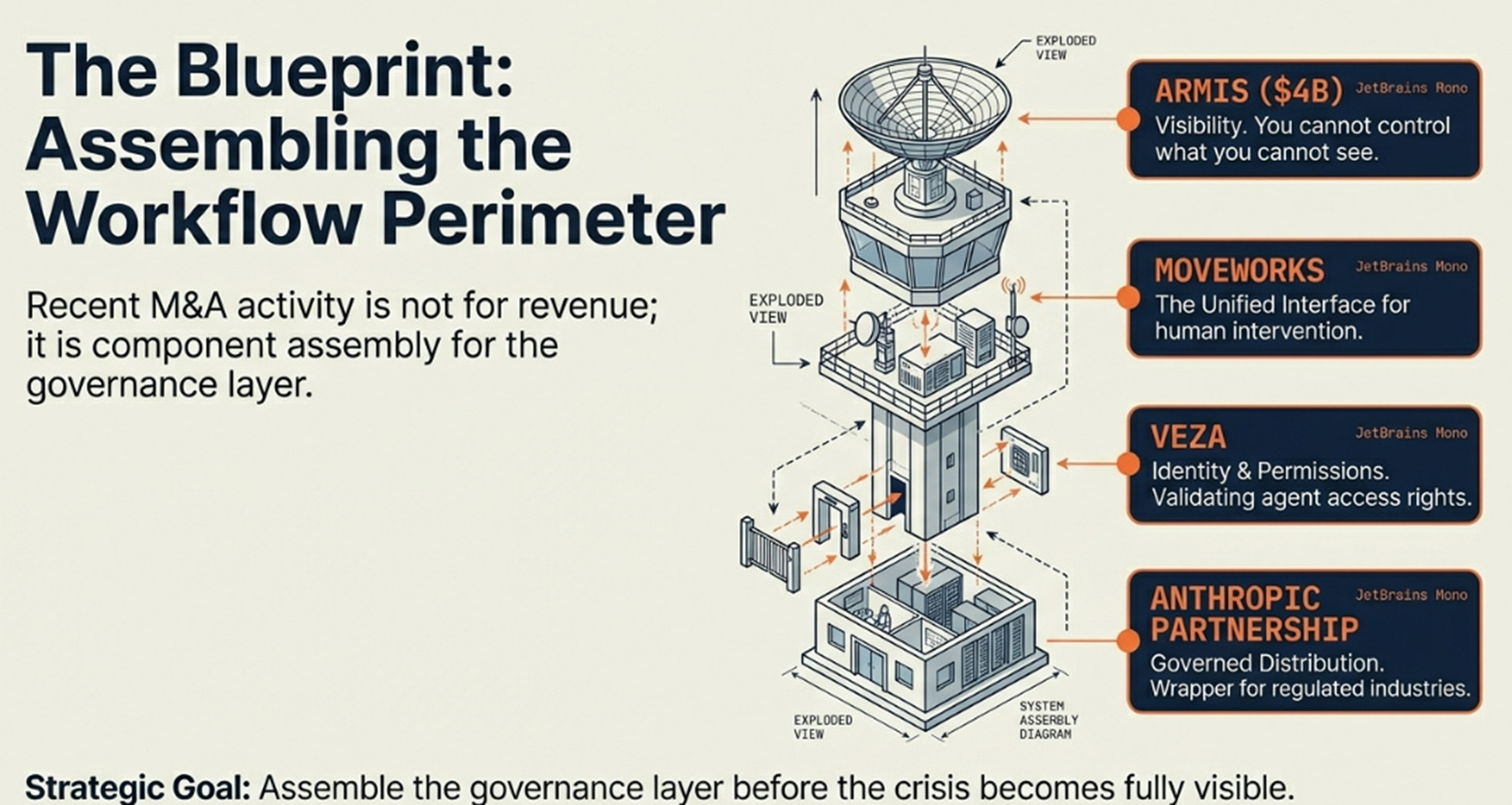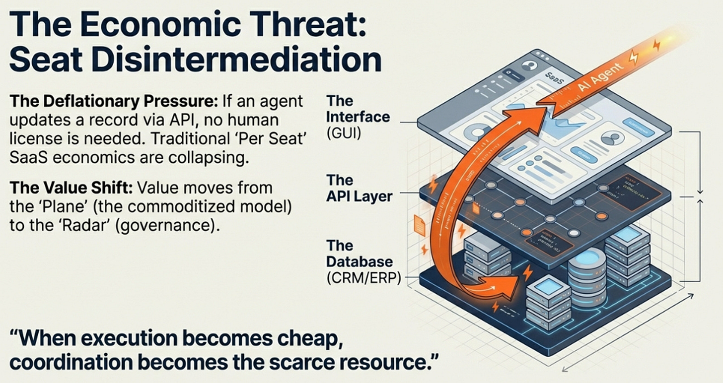 The Coordination Imperative has arrived: when execution becomes cheap and abundant, coordination becomes the scarce resource. Value shifts from the plane (the model, commoditizing) to the radar and tower. ServiceNow isn’t building the fastest plane. It’s building air traffic control.