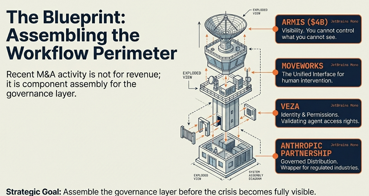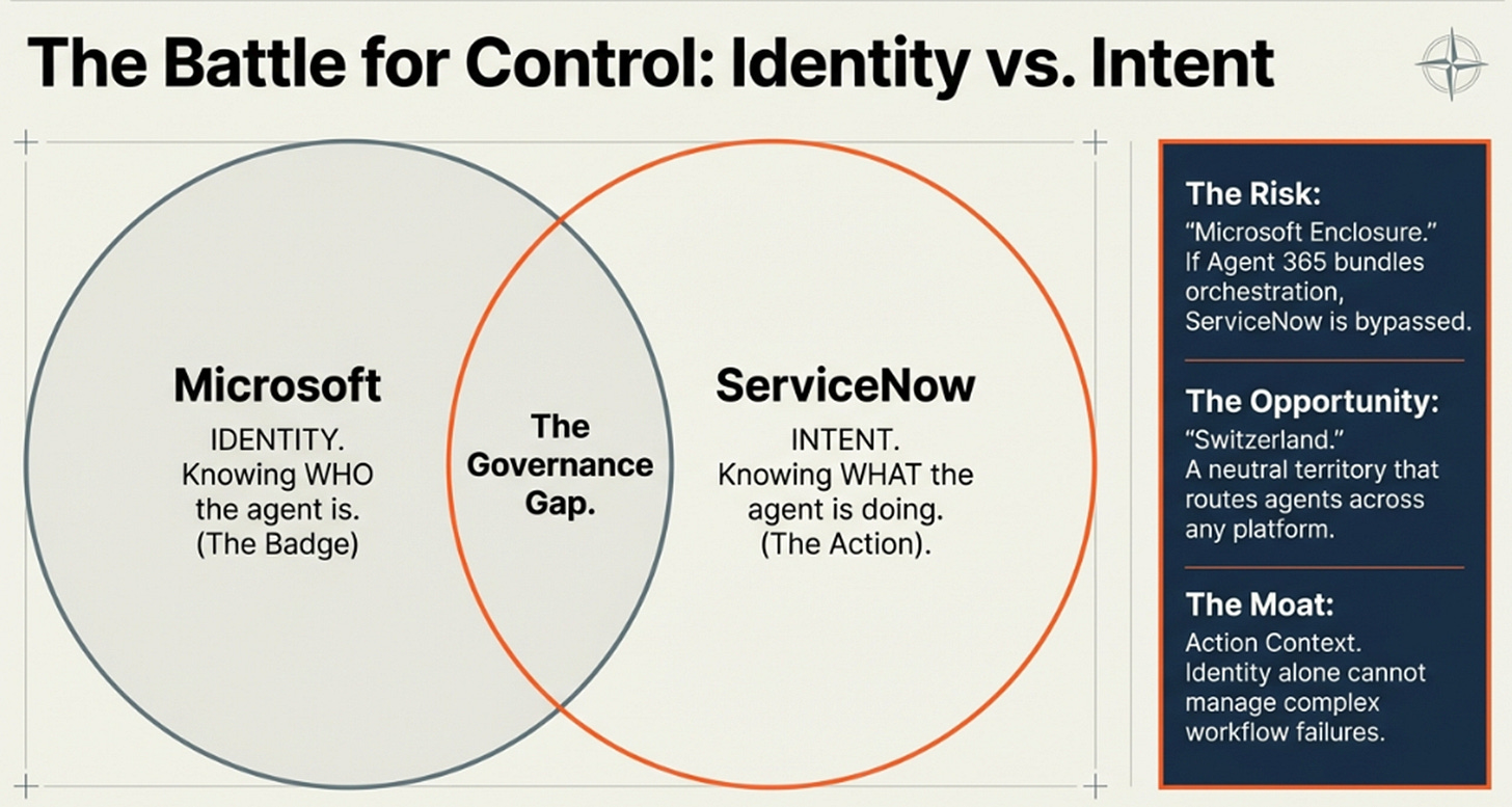 These aren’t revenue-padding acquisitions. ServiceNow is assembling components to govern a workforce without physical presence that doesn’t open applications. Microsoft Agent 365 owns the identity perimeter, who can this agent authenticate as? ServiceNow owns the workflow perimeter, which agent executes which process? Adjacent control points, not competitive.