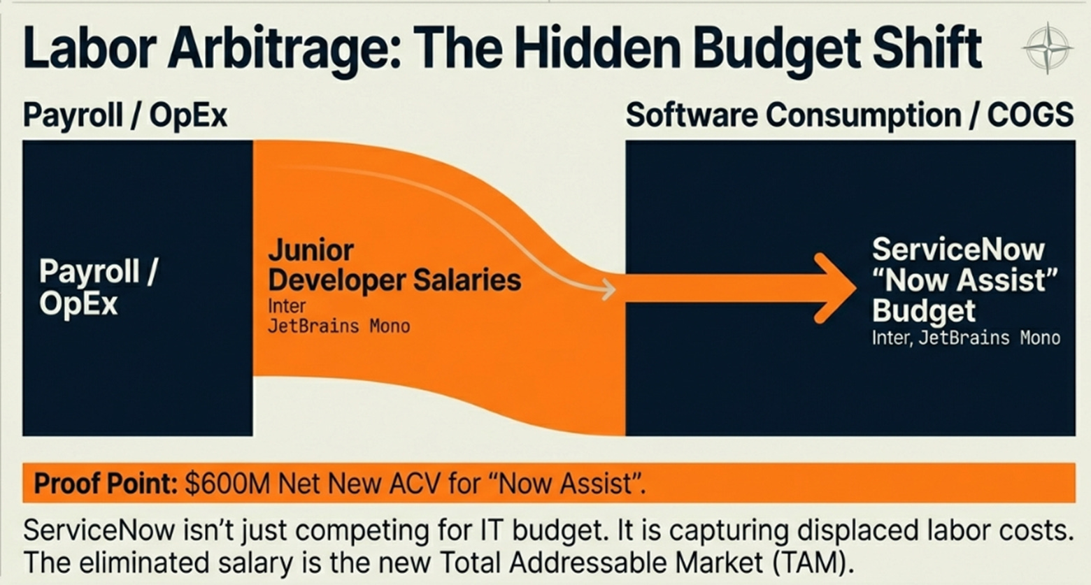 Finally, the labor arbitrage: market fears junior developer role elimination. Variant: ServiceNow captures budget previously allocated to junior salaries. The $600M Now Assist proves enterprises will make that trade.