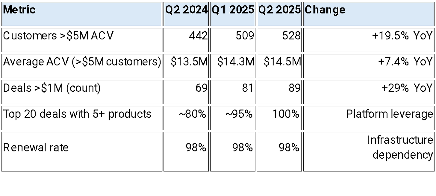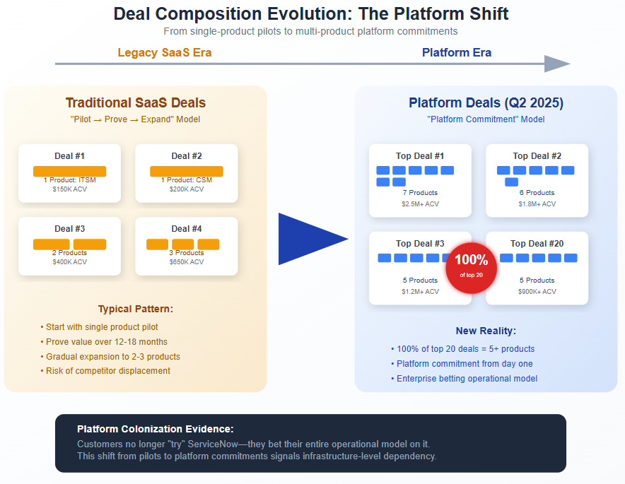 ServiceNow’s Q2 marked a shift from software vendor to enterprise infrastructure provider, with 100% of top 20 deals including 5+ products—clear evidence of platform consolidation and deep integration across workflows.