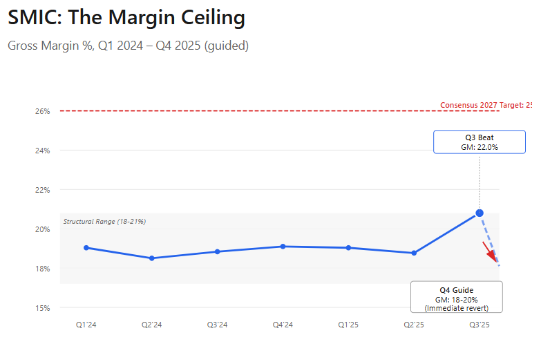 Three months ago, the thesis on SMIC centered on a simple proposition: the company’s capital intensity and operational mandate create a margin ceiling that markets are ignoring. Consensus expected steady margin expansion toward 25% as scale benefits materialized. The thesis argued depreciation math and mission priorities would keep margins in the 18-21% range regardless of volume growth.