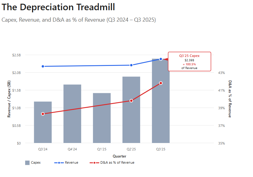Capex as a Trap, Not a Growth Lever: With $2.4B in Q3 capex—roughly equal to revenue—depreciation now consumes over 40% of sales. Scale only deepens the drag.