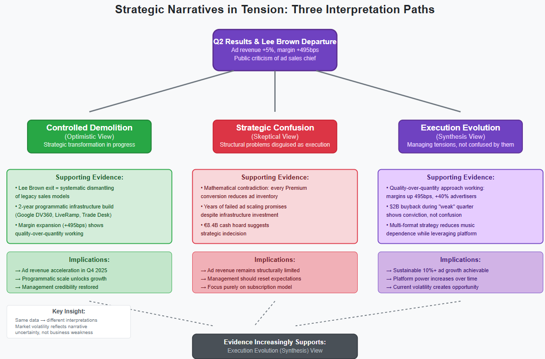 Three competing interpretations of Spotify's Q2 results have emerged among analysts and investors, each capturing part of a complex reality that resists simple categorization.