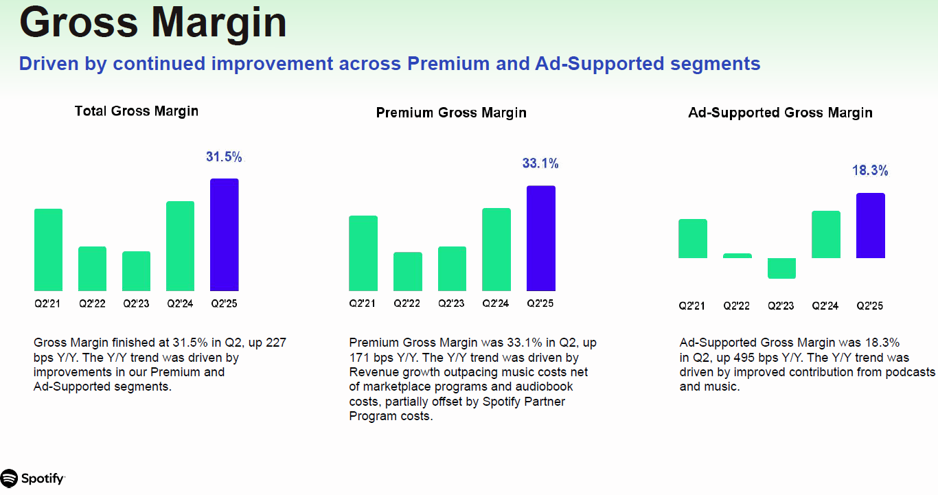 Evidence for this synthesis comes from how Spotify has handled the advertising revenue challenge. Rather than simply pursuing volume growth, the company has focused on improving advertising gross margins, which jumped 495 basis points year-over-year to 18.3%. This represents a quality-over-quantity approach that optimizes for contribution rather than top-line growth.