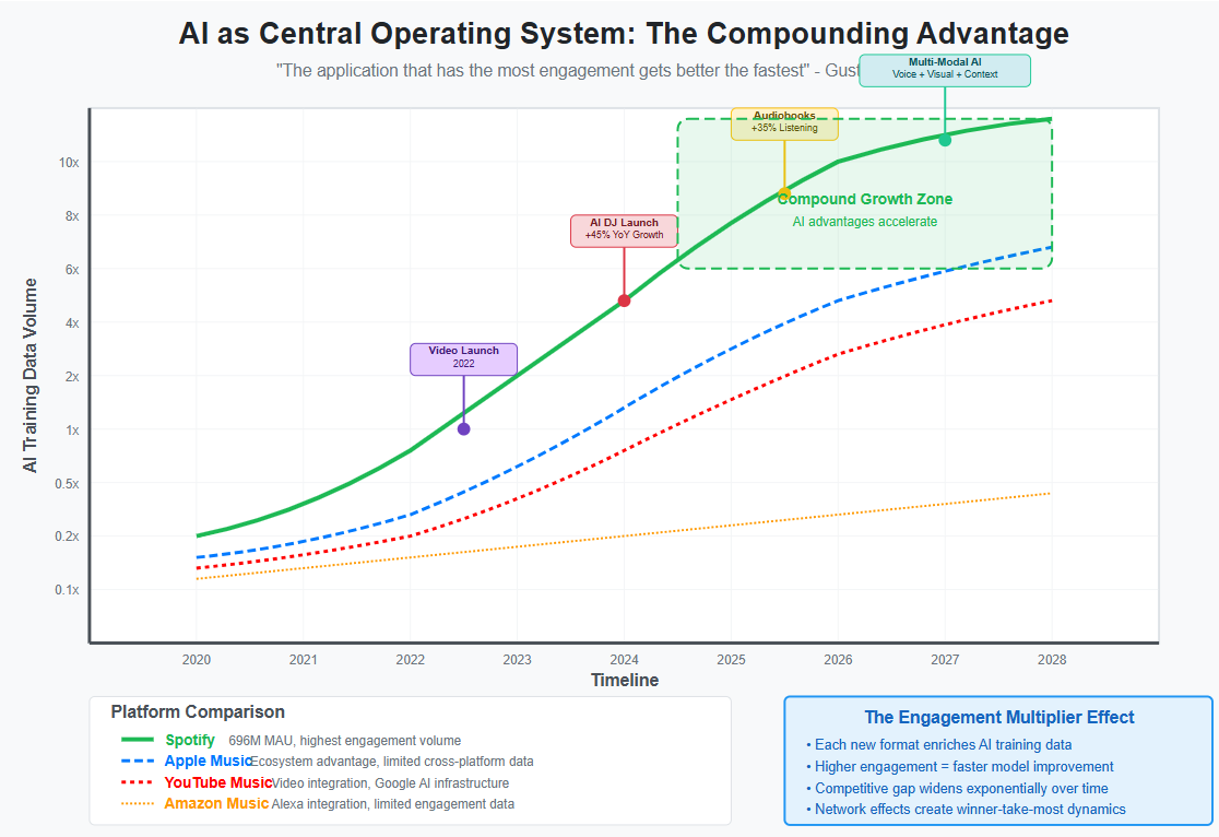 Each new format that Spotify adds—video, audiobooks, educational content—enriches the training data for its AI systems, creating accelerating returns to scale. This creates what economists call increasing returns to scale in AI development, where each user interaction makes the platform more valuable not just for that individual but for all users globally.