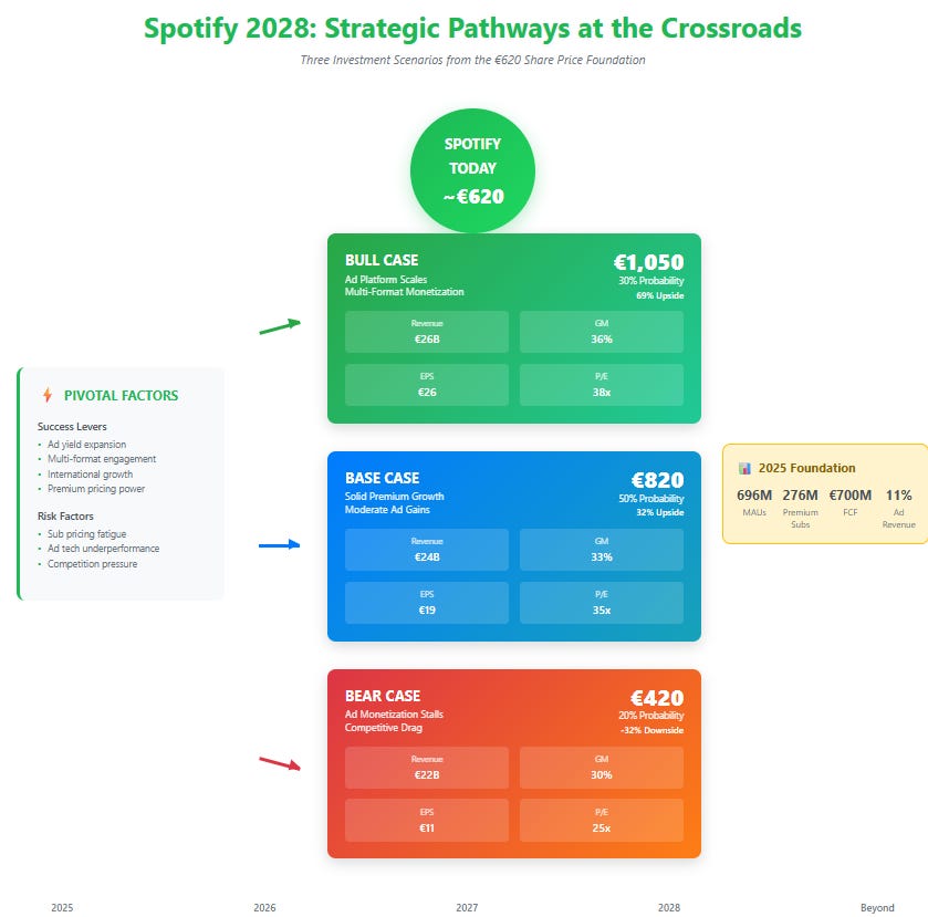 The complexity of Spotify's current position requires scenario-based thinking rather than linear extrapolation. Consider three plausible outcomes over the next three years:
