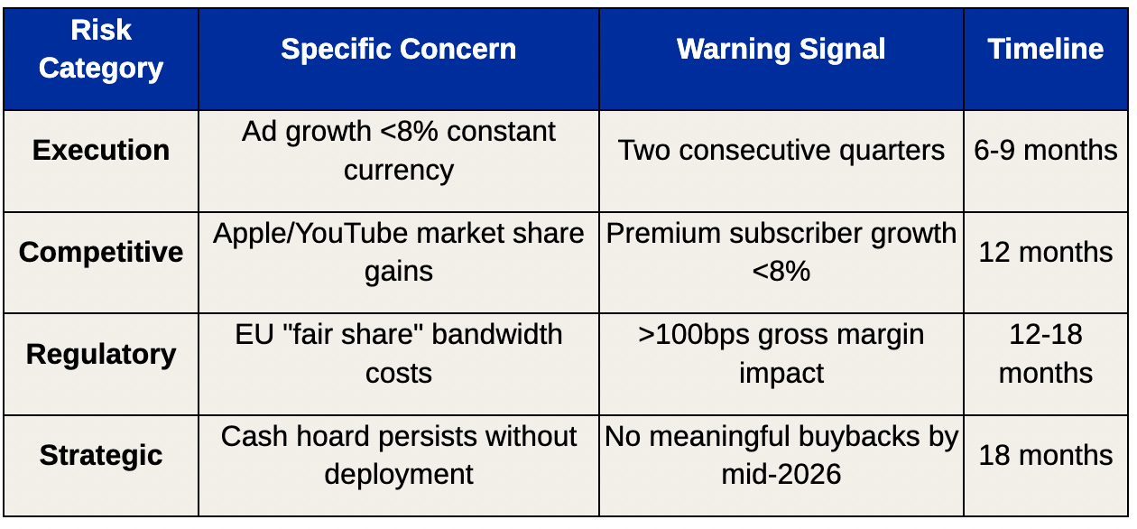 The risk that receives less attention but could prove most significant involves management's ability to deploy growing cash generation effectively. If Spotify's cash position continues growing without meaningful deployment through acquisitions, accelerated investments, or capital returns, it would suggest strategic indecision.