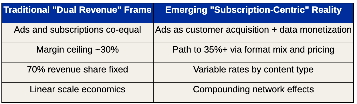But as the platform scaled and competitive dynamics intensified, this dual-revenue model revealed inherent tensions that couldn't be resolved through execution improvements alone. The core tension is mathematical: every successful conversion from a free user to a Premium subscriber removes advertising inventory from the platform.