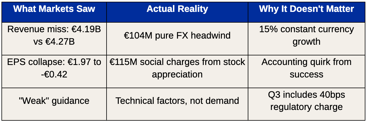 When markets punish a stock 12% in a single day, the conventional wisdom assumes something fundamental went wrong. In Spotify's case, three headline metrics seemed to confirm this narrative: revenue missed consensus by €80 million, earnings per share collapsed from an expected €1.97 profit to a €0.42 loss, and third-quarter guidance came in below Street expectations.