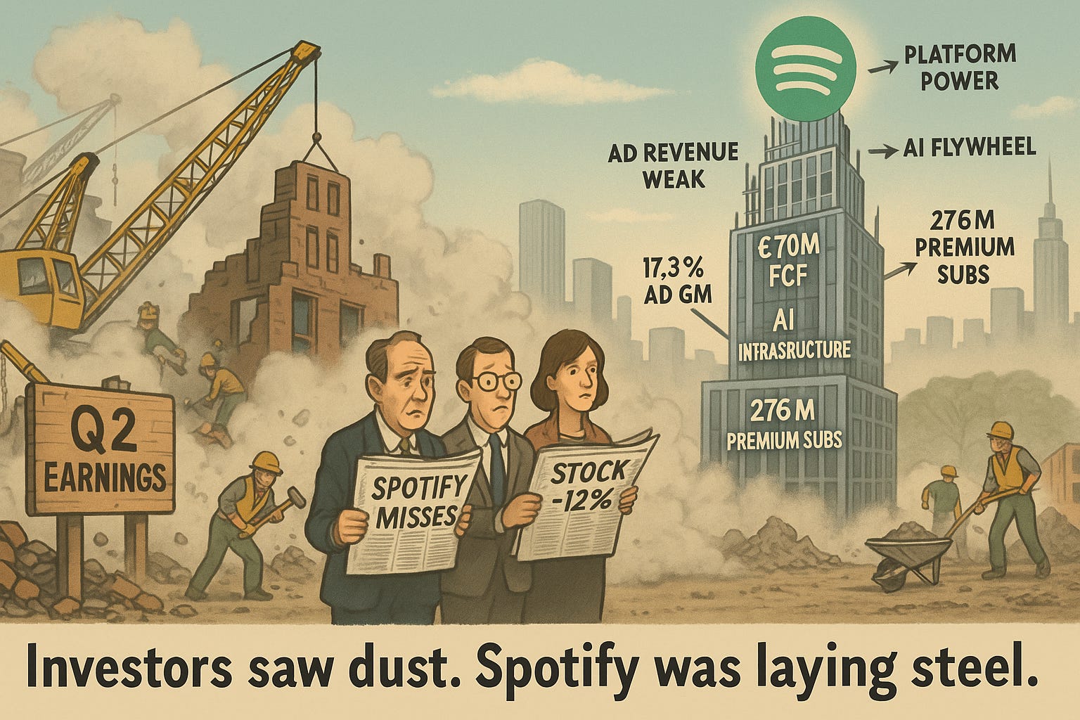 This distinction—between surface disruption and structural progress—captures precisely what happened when Spotify reported Q2 2025 earnings on July 29th. A 12% stock decline following the announcement suggested investors saw only falling debris. But underneath the accounting dust of foreign exchange headwinds and Swedish payroll tax quirks, Spotify was quietly installing the steel beams of its next evolutionary phase.