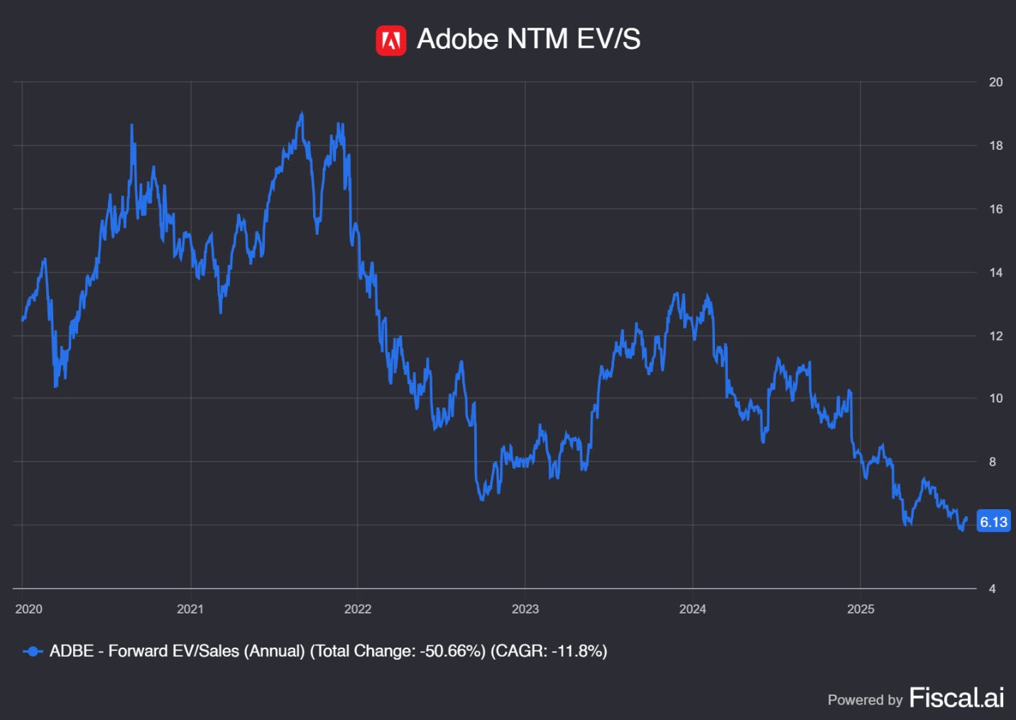 Why ADBE trades at “maximum uncertainty” (≈6.7× EV/Sales) and what must change for the multiple to reset.