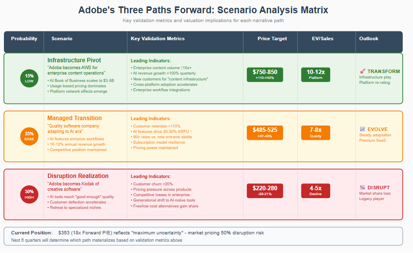 The current equilibrium at 6.7x sales reflects maximum uncertainty about which narrative will prove correct. This uncertainty creates both opportunity and risk: if Adobe successfully demonstrates infrastructure transformation, the stock could double; if competitive disruption accelerates, it could fall 40%.