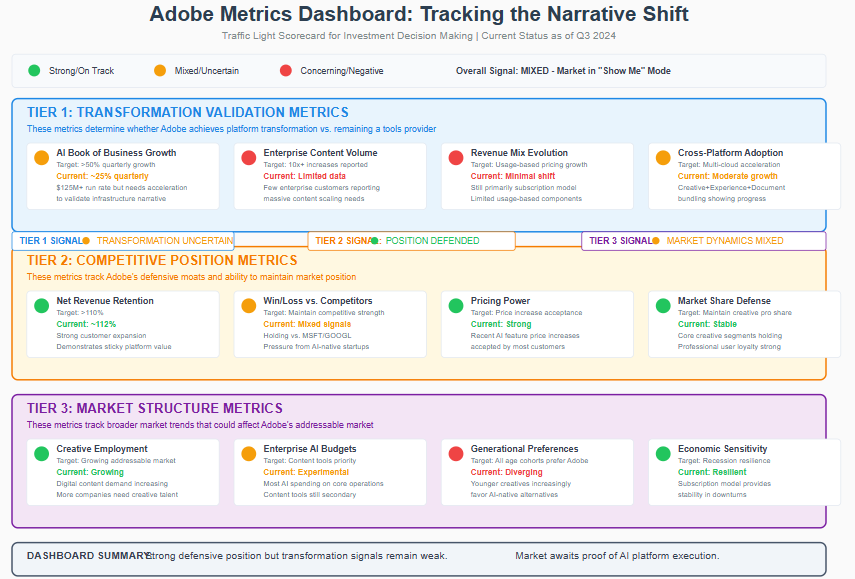 Given the narrative-driven nature of Adobe's valuation, investors should focus on leading indicators that signal which story is emerging as dominant.
