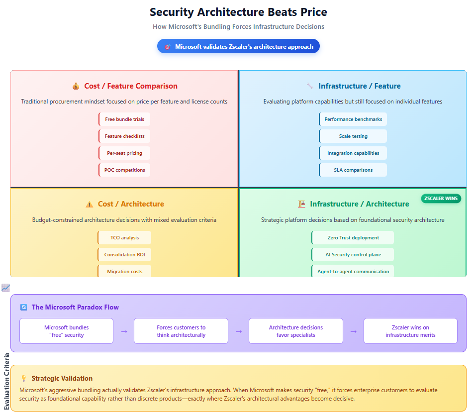 Microsoft's "free" security actually validates Zscaler's infrastructure approach. When Microsoft throws security into Office 365 bundles, it forces enterprise customers to think about security as foundational capability rather than discrete products. This creates helpful market education: customers start evaluating security architectures instead of comparing feature checklists.