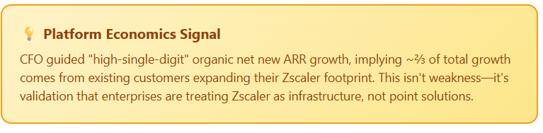 The real story is in CFO Kevin Rubin's guidance for "high single digit net new ARR growth in fiscal 2026 on an organic basis." Do the math: if total ARR is growing around 22-23%, and organic net new growth is in the high single digits, that means roughly two-thirds of Zscaler's growth is coming from existing customer expansion. This isn't weakness—it's validation of platform economics at work.