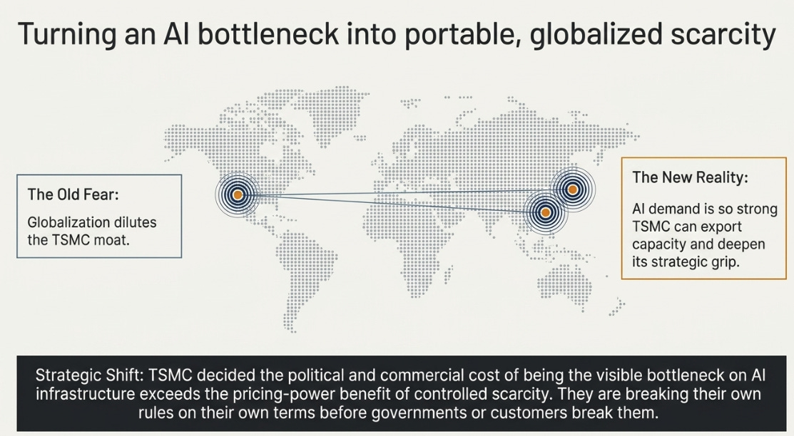 That move suggests TSMC is turning scarcity into something portable: it can globalize capacity without obviously weakening its strategic grip on AI infrastructure.