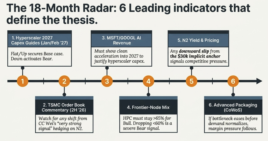 Bear case: not an AI collapse scenario. Hyperscaler ROI on 2025-26 capex disappoints enough in 2027 that 2028 wafer agreements get renegotiated, N2 dilution runs worse than guided, and the multiple compresses as the AI infrastructure trade broadly unwinds. TSMC retains its market position. The stock does not retain its multiple. Probability reflects that this is a tail scenario, not a base case, but one large enough to respect.