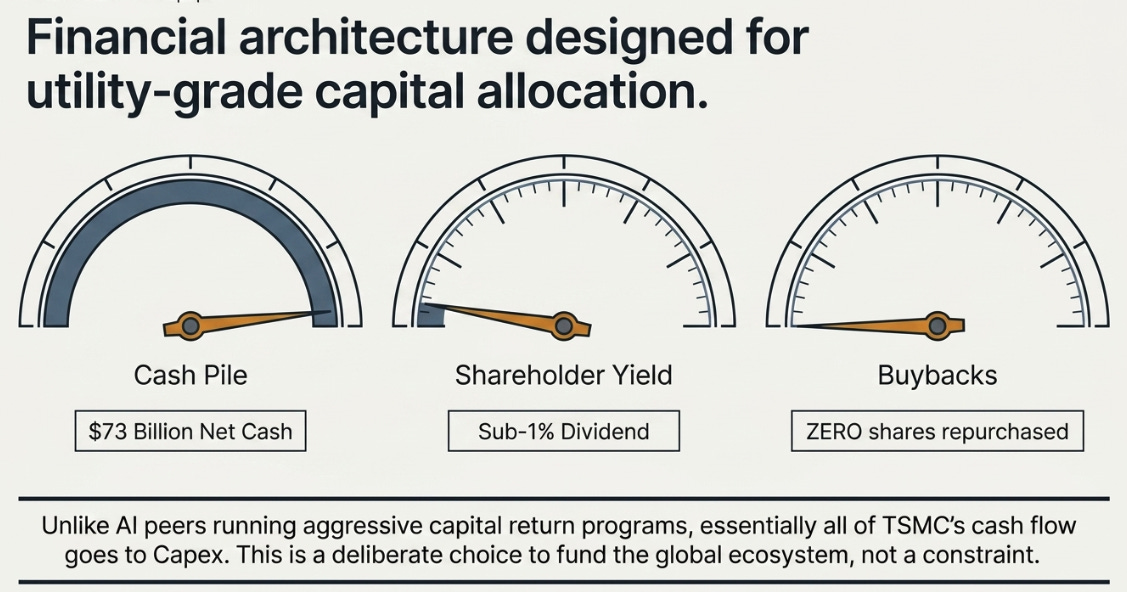 The capital allocation posture is consistent with this. TSMC has roughly $73 billion in net cash, pays a dividend yielding under 1%, and has never repurchased shares. Essentially all cash flow goes to capex. This is utility-grade capital allocation, not AI-infrastructure-leader capital allocation, and it is another deliberate choice, not a constraint.