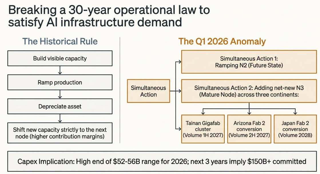 Morris Chang built TSMC on the rule that you do not add capacity to a mature node. CC Wei broke that rule today, deliberately, after personally verifying demand with the people writing the checks. That is the strategic event of Q1 2026.