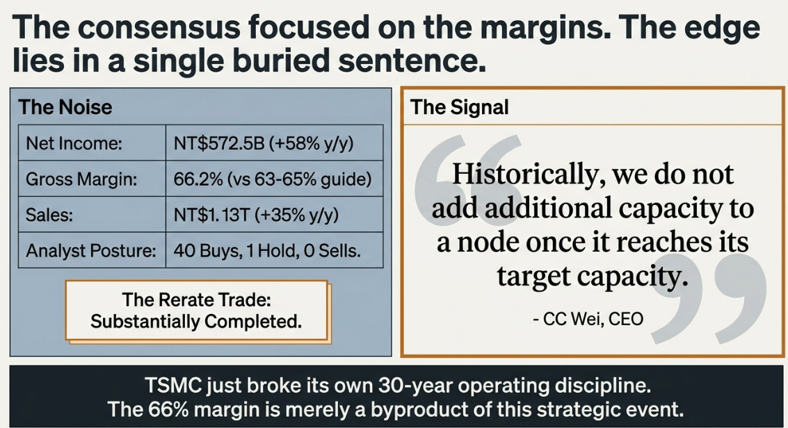 TSMC didn’t just beat and raise: it broke a long-standing rule by adding fresh N3 capacity at a mature node, which signals unusually strong demand visibility.