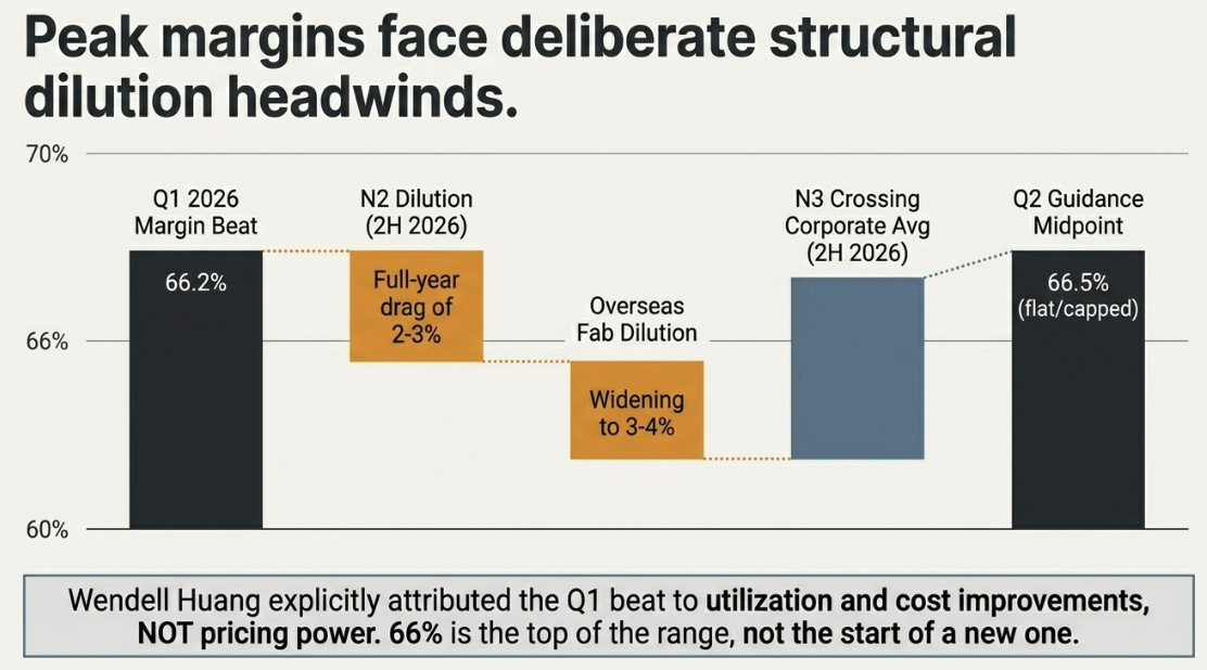 The margin beat’s composition matters more than the headline number. Wendell attributed the 120bp beat versus guidance to “higher-than-expected overall capacity utilization rate and better cost improvement efforts”, explicitly not to pricing. Q2 guidance of 66.5% gross margin midpoint adds only 30 basis points QoQ, a sharp deceleration from Q1’s 390bp jump, because N2 dilution flows through in 2H 2026 at 2-3% full-year drag, overseas dilution widens from 2-3% in early stages to a newly-disclosed 3-4% in later stages, and the offset is N3 crossing corporate-average margin in 2H 2026. The puts and takes roughly net to flat-to-slightly-up margins at peak utilization. The 66% is closer to the top of the range than the start of a new one.