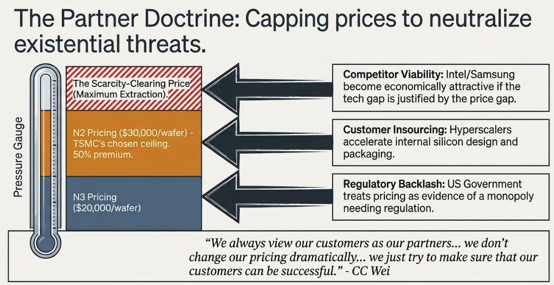 N2 wafers are reportedly priced around $30,000, versus $20,000 for N3 at similar maturity. A 50% ASP premium for one node transition is very high in absolute terms, but it is only modestly above what the cost structure would predict. TSMC is not extracting maximum surplus from Nvidia, Apple, or AMD. They are deliberately leaving margin on the table. If TSMC priced at the actual scarcity-clearing level for N2, Samsung and Intel become economically attractive again because the price differential would justify the technology gap; hyperscalers accelerate internalization of design and packaging; the U.S. government treats TSMC’s pricing as evidence the company needs to be regulated or domesticated. The partner doctrine is the strategic equivalent of OPEC choosing to sit below the squeeze level, not because they cannot squeeze, but because they understand the second-order consequences.