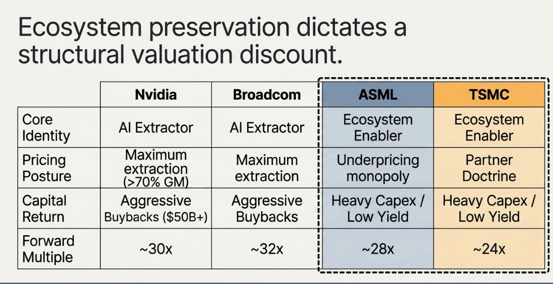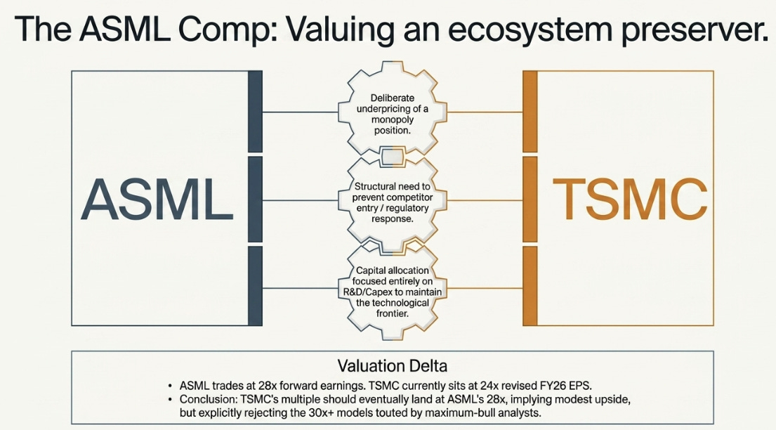 The right comp is ASML, 28x forward, same strategic posture of deliberately underpricing a monopoly position to preserve a customer ecosystem, same structural reason for why maximum rent extraction would invite both competitive entry and regulatory response. ASML’s multiple is where TSMC’s should eventually land, not Nvidia’s or Broadcom’s. That implies modest further upside from the current 24x, maybe to 26-28x, but not the 30x-plus some bulls are modeling. The discount to NVDA and AVGO is not a mispricing. It is TSMC’s strategic posture correctly reflected in the multiple.