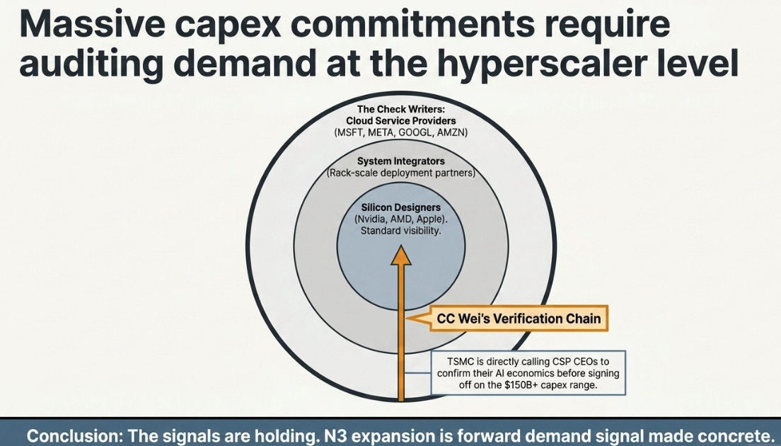 Two readings of the announcement are both true and both worth holding. The first is that demand visibility through 2027–2028 is now large enough that N2 cannot meet it alone, and N3 expansion is forward demand signal made concrete. CC’s verification chain matters here: he repeatedly references “customers, customers’ customers, and the CSPs”, TSMC is auditing demand at the hyperscaler level, not just at the silicon designer level, before committing. That is the same verification process Wei described doing personally last quarter when he called cloud service provider CEOs to confirm their AI economics before signing off on the original capex range. The signals are holding. The capex is moving up in response.