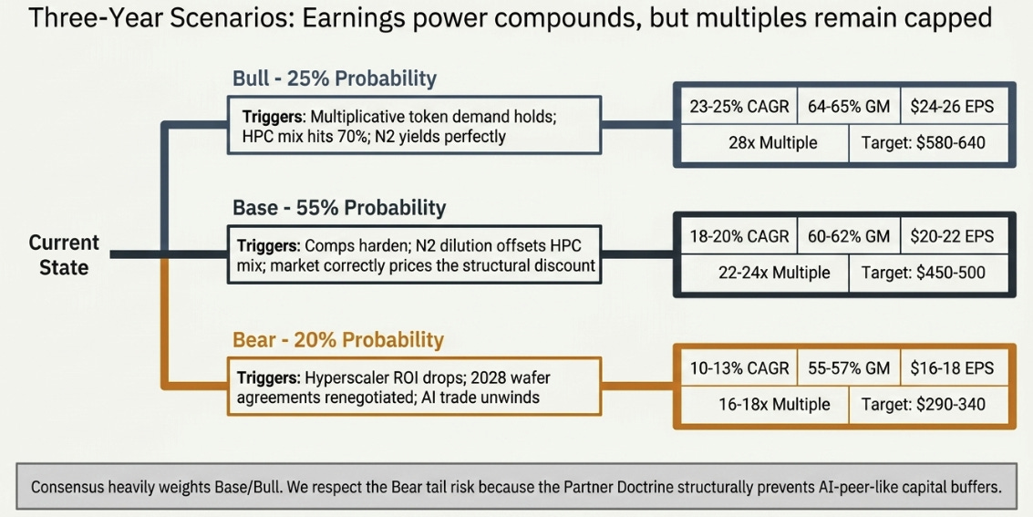 Base case: demand stays strong but normalizes. Revenue growth decelerates from 30%+ in 2026 to high-teens by 2028 as comps harden. Margins hold in low-60s as N2 dilution offsets HPC mix tailwind. Multiple stays close to current levels, the market correctly prices the structural discount. This is roughly where consensus sits, though consensus implicitly models a higher multiple than we do.