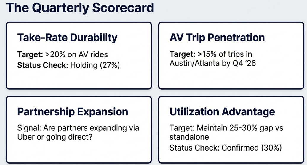The thesis is falsifiable. The single most important metric is take rate on autonomous rides. If Uber maintains 25-27% platform fees while fleet operators earn attractive returns, the coordination layer captures value durably. If take rates compress toward 15-18%, suppliers have pricing power and the duopoly thesis gains credibility.