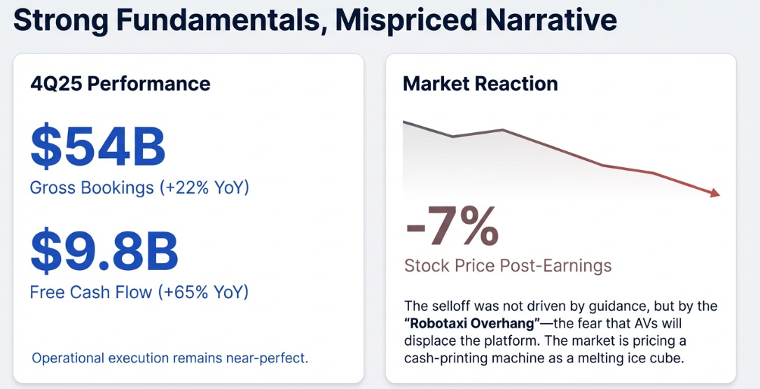 Uber reported strong fourth-quarter earnings earlier in the week, $54 billion in gross bookings, up 22%; $2.8 billion in free cash flow, up 65%, and the stock fell 7%. The stated reason was a slight earnings guidance miss driven entirely by a UK tax accounting change with zero economic impact. The real reason is that the market still doesn’t know what Uber is worth in a world where cars drive themselves.