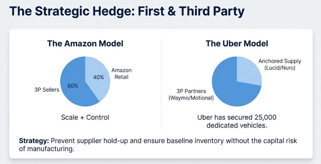 Uber is moving toward a similar structure. Host multiple third-party autonomous fleets (Waymo, Cruise, Motional) while maintaining dedicated capacity that can’t be pulled off the platform. Learn operational intelligence from hosting Waymo, which routes generate best margins, which vehicle configurations maximize utilization, where demand is most predictable, then apply that to optimizing first-party deployment.
