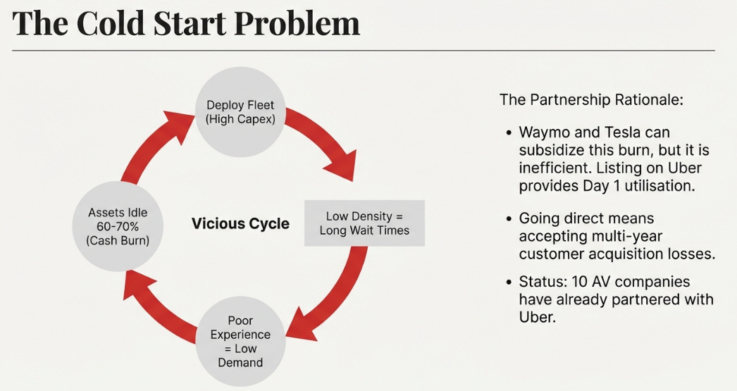This is why ten different autonomous vehicle companies have chosen to partner with Uber rather than go it alone. It’s not charity. It’s unit economics. Listing on Uber means day-one utilization at commercially viable levels. Going direct means multi-year customer acquisition losses.