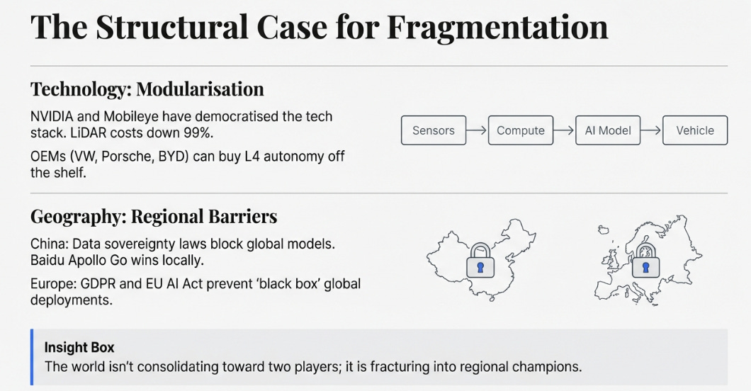 But the base case, the one the evidence currently supports, is that autonomy fragments rather than consolidates. Multiple technology providers reaching “good enough” via NVIDIA and Mobileye. Geographic barriers preventing global winners. Operational complexity remaining high. Consumer preference defaulting to “the app that always works.”