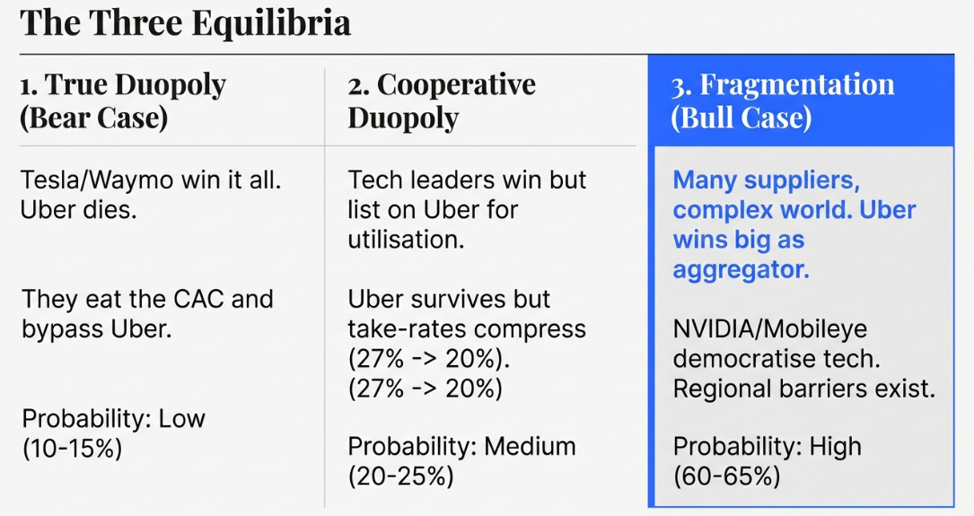 In this world, Uber survives but faces take-rate pressure. If there are only two suppliers with demonstrably superior technology, they have negotiating leverage. Uber’s take rate might compress from 27% toward 20% or below.