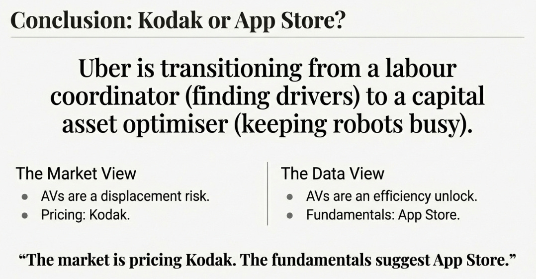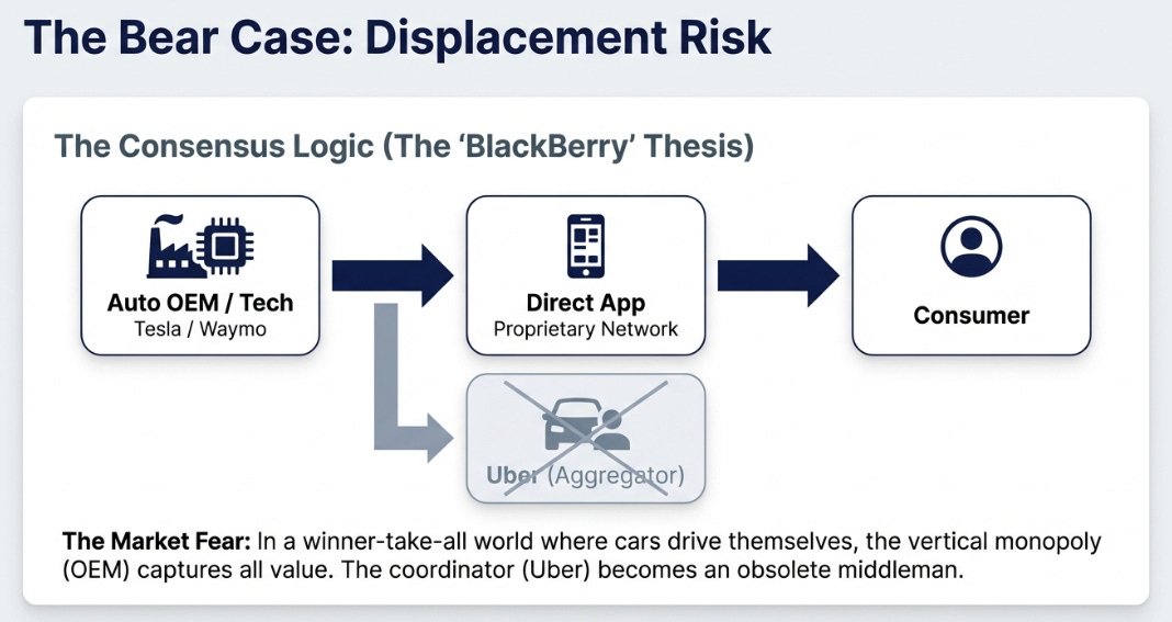 The autonomous vehicle overhang has haunted Uber’s valuation for years. The logic seems airtight: Waymo and Tesla will build robotaxi networks that bypass Uber, eliminating the need for a platform that connects riders to drivers once there are no drivers to connect. Uber becomes BlackBerry, a coordinator rendered obsolete when the thing being coordinated changes.