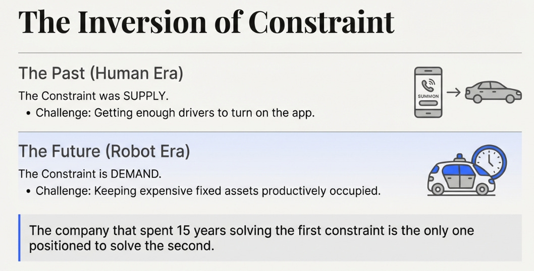 Autonomous vehicles invert the constraint. Supply becomes abundant and capital-intensive. The scarce resource becomes demand aggregation, keeping expensive fixed assets productively occupied.