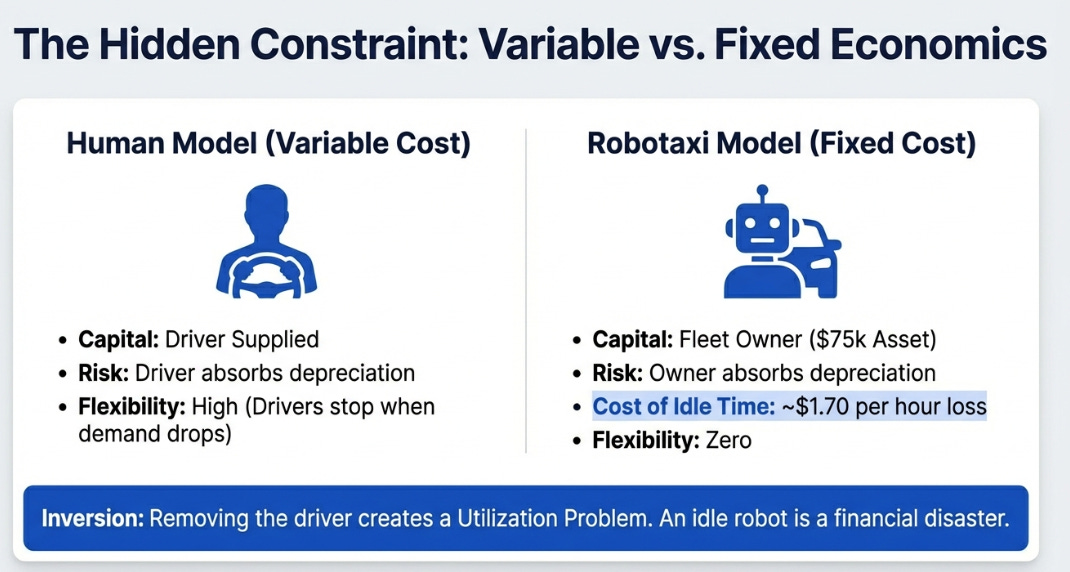 A human-driven Uber operates on variable cost. Drivers supply their own capital (the car), absorb the depreciation risk, and turn on the app when they want to earn. Uber’s capital intensity is near zero. When demand drops, drivers stop driving. When demand spikes, more drivers appear. The cost structure flexes with utilization.